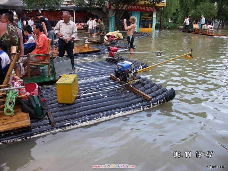 计算所用的图片如下,具体过程就不说了,但有一点得说明一下,因为广告牌就在离路边不远的地方,竹筏的走动会引起水面波动。水痕有约5厘米的宽度,到底哪里才是真正的最高水位线呢?计算过程中分别取中间和两边各算一回。结果是:取中间时和水东门上刻度线相符,取两边计算,误差正好也是2.5厘米。