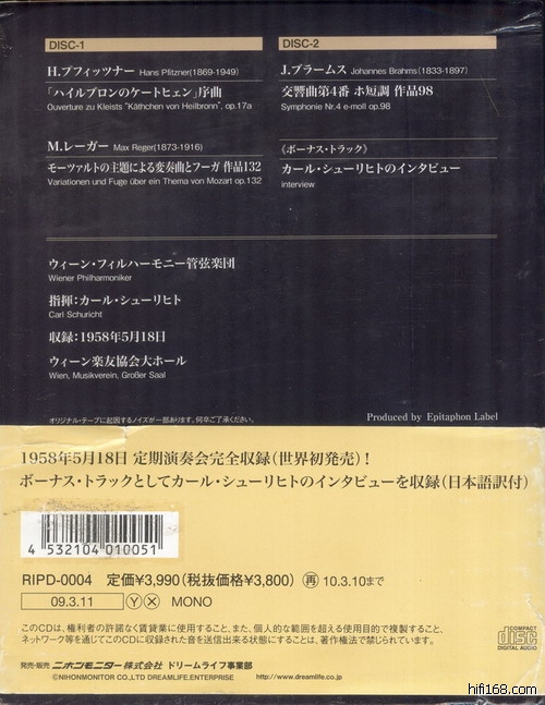 由日本dreamlife公司复刻的,由勃总最为敬仰的伟大的卡尔.舒里希特指挥维也纳爱乐乐团音乐会实况录音!曲目为普菲茨纳、雷格和勃拉姆斯管弦乐作品,2cd豪华包装3900日元!附当年音乐会说明书一份!