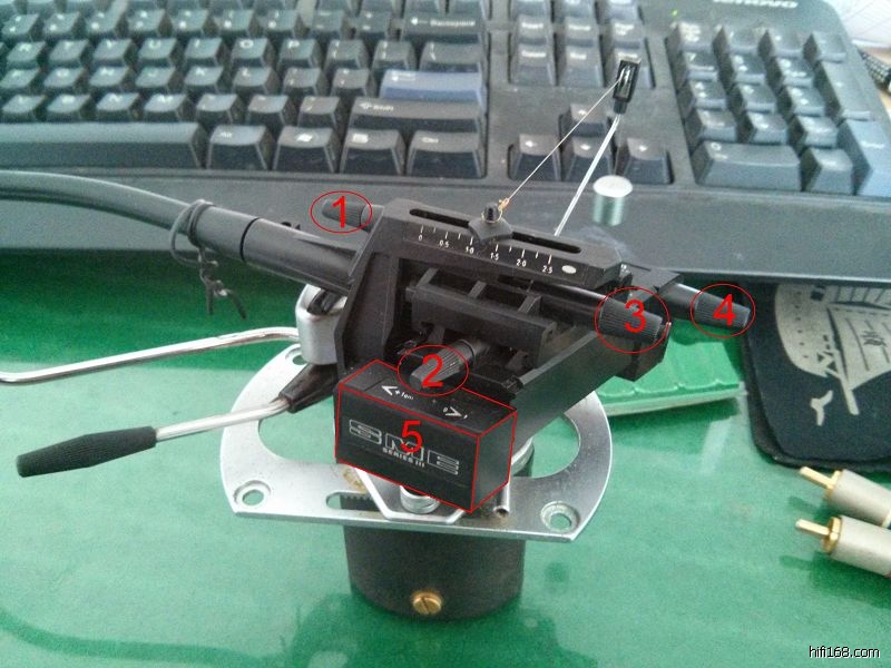 唱臂是2手买的,卖家没什么资料提供,只能自己琢磨,玩弄了半天实在是有点复杂!弄了张图,发现一共有5个地方可以调整。大概知道2是调整唱头角度的,3是调整针压的,不知道对不对。其他的就不知道了