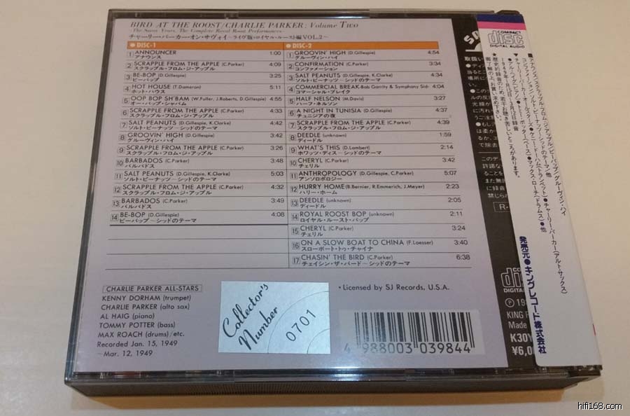 [color=#444444][font=微软雅黑, Tahoma,]2、Charlie Parker - The Complete Royal Roost Performances (1949年Royal Roost爵士现场) 2CD 88年 King Reords 6000日元 侧标新 盘面九成新 280元[/font][/color]
