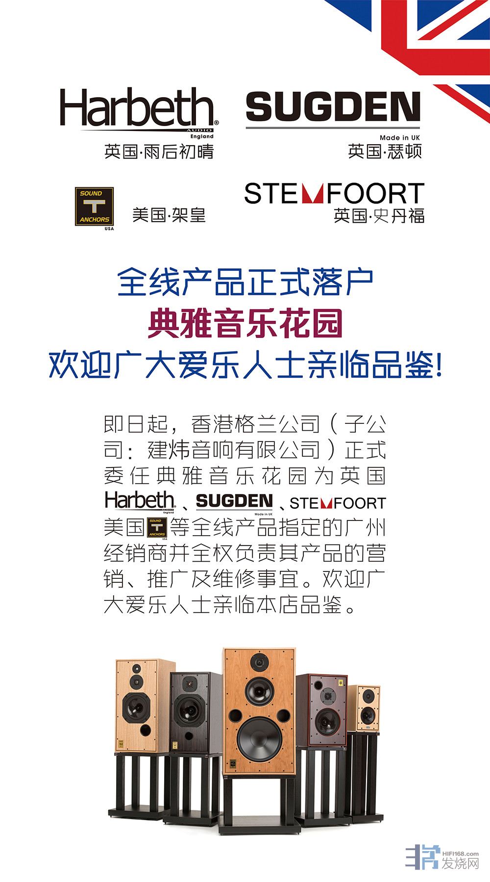 热烈祝贺,香港格兰公司正式委任典雅音乐花园为英国Harbeth(雨后初晴)、SUGDEN(瑟顿)、Sound Anchors(美国架皇)、Stemfoort(史丹福)指定的广州经销商,并全权负责其产品的营销、推广及维修事宜。