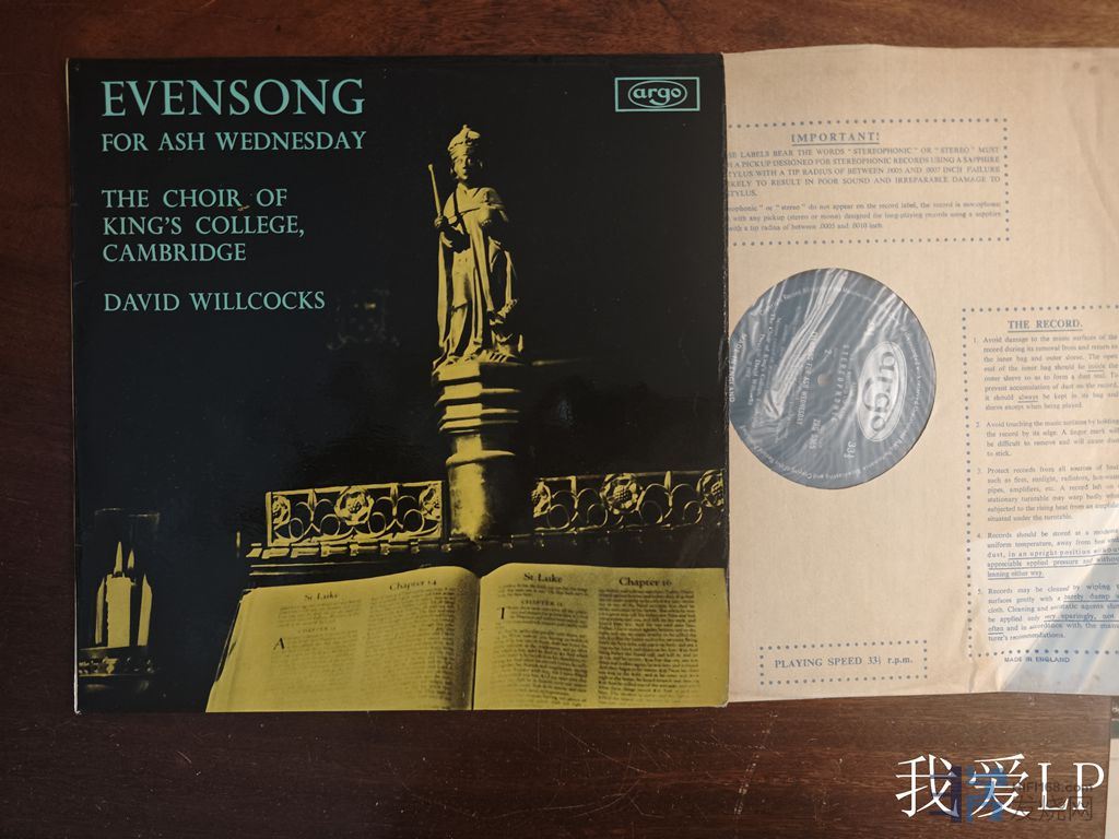 11120,TAS榜名盘《Evensong For Ash Wendesday》(灰烬星期三晚祷),威考斯指挥剑桥学院合唱团。Argo英国椭圆标带沟头版,NM,280