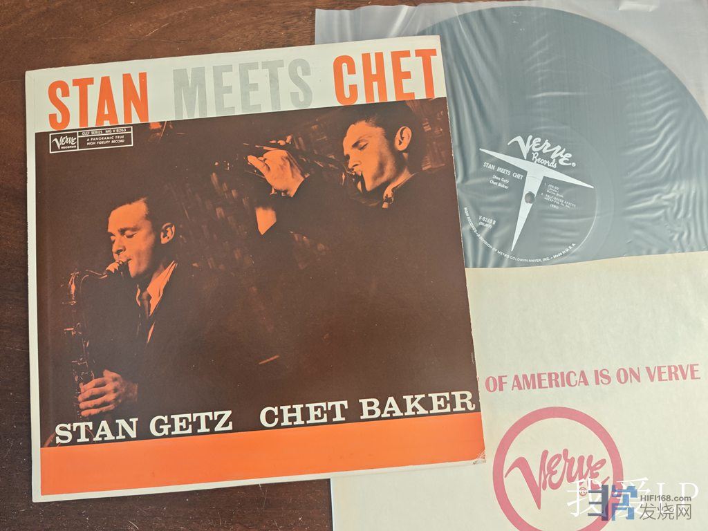 11217,经典爵士名盘《Stan Meets Chet》,中音色士风大师斯坦.盖茨与爵士小号大师查特.贝克1958年发行的融合酷爵士与Bossa Nova的融合风格专辑,也是两位大师合作仅有的几张专辑中最重要的一张!Verve美国60年代初期版,NM-(如新!仅强光下勉强可见极其虚弱擦痕),270