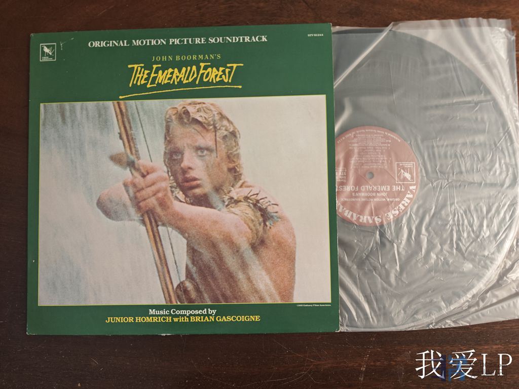 11238,TAS榜名盘,电影《The Emerald Forest(翡翠森林)》原声大碟。Varese Sarabande美国头版,NM-(如新!仅因两面开始轻微变形,短暂稍有抖晃,但绝不影响播放和声音),特价238