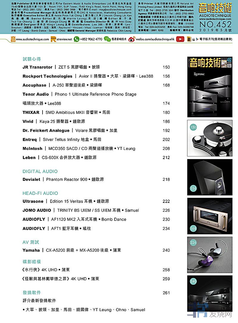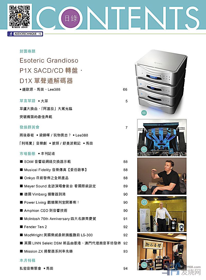 今期封面专题由锺启源、马田、Lee388评论Esoteric Grandioso P1X SACD/CD转盘.D1X单声道译码器,本月特稿 : 私密音乐聚会,其他评论文章包括:JR Transrotor ZET 5 黑胶唱盘、Rockport Technologies Avior II 扬声器 Accuphase A-250单声道后级 Tenor Audio Phono 1 Ultimate Reference Phono Stage唱头放大器 、THIXAR SMD Ambitious MKII音响架 、Vivid Kaya 25扬声器、Dr. Feickert Analogue Volare黑胶唱盘、Entreq Silver Tellus Infinity 地盒、McIntosh MCD350 SACD / CD两声道播放机 Leben CS-600X合并放大器、Devialet Phantom Reactor 900Ultrasone Edition 15 Veritas耳机 JOMO AUDIO TRINITY BS UIEM / SS UIEM耳机 AUDIOFLY AF1120 MK2入耳式耳机、Yamaha CX-A5200前级 + MX-A5200后级  ....,详细内容请参阅目录。