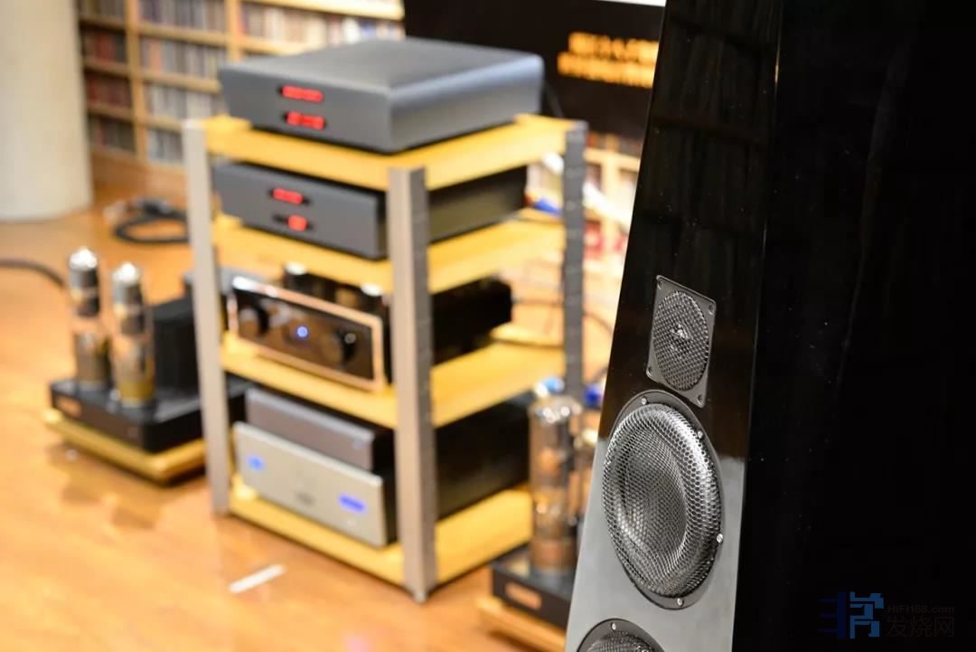 这款音箱是这次搭配活动中体型最小的一对,按理说这对音箱更适合在30平方米左右的空间发挥,在这次超过60平方米的大试音室中,未听之前我不禁为TIDAL捏一把汗。Contriva如今已经发展到第二代G2,眼前这对是第一代,但总体设计上是基本一致的,新款改良了喇叭单元,但第一代当年上市时已经是业界最顶尖的水平了。Contriva的箱体采用MDF中密度纤维板,Tidal称之为HP-MDF,重点是箱体的不同位置厚度并不是一样的,而是1.5英寸到3英寸不等。厚实的箱体完成之后,Tidal认为刚性还是不够,所以Tidal在内部设计了Resonance Minimising Design(RMD),也即是加上框架/横梁补强。这样的强化设计可以很好地控制箱体内部的谐振,达到更纯净的重播效果。Contriva为3路4单元设计,单元采用德国Accuton专门定制的BCC-Drivers(黑色涂层陶瓷)长冲程单元,包括两个9英寸黑色涂层陶瓷低音单元、一个7英寸陶瓷中音和1.2英寸钻石振膜高音。
