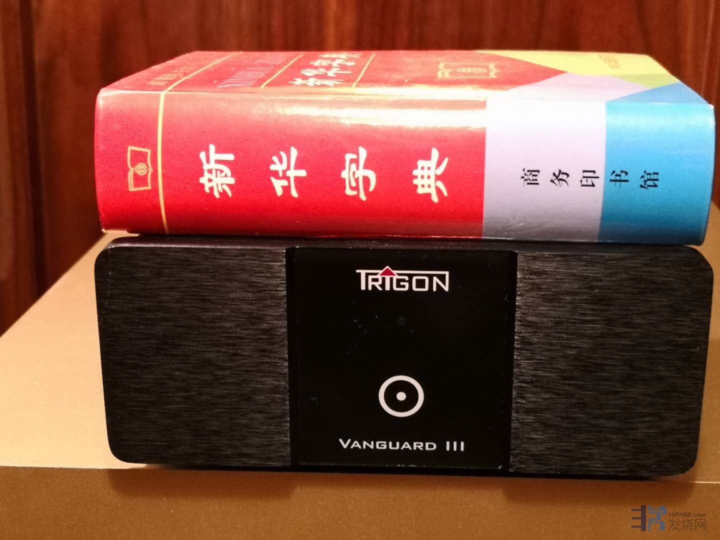 这款唱放尺寸并不大,套件共两个,一个主机,另一个是伴侣供电。有多大呢,我在书房看到新华字典,拿过来一放,还真匹配,唱放就这么大。现在暂时还没有在机架上腾出合适的地方,先放在地板上也不占地方。