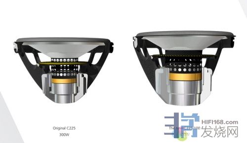 其实这是因为所使用的单元改良了,只要单元一改变,箱体、分音器也都得改变。G1S的低音单元从原本只能承受300瓦的C225改为能承受600瓦的C225-100。这个新的低音单元振膜尺寸没变,但音圈的高度从原本12mm增加为35mm,而音圈的直径也从原本的75mm增加到100mm,此外框架也重新铸成。