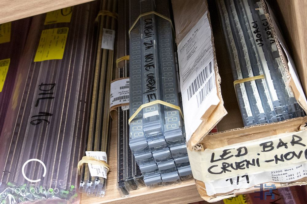 车间在一楼。也有许多用于设备部件的架子。其中一些是由 Karan Acoustics 提前几个月在缺货前采购的。