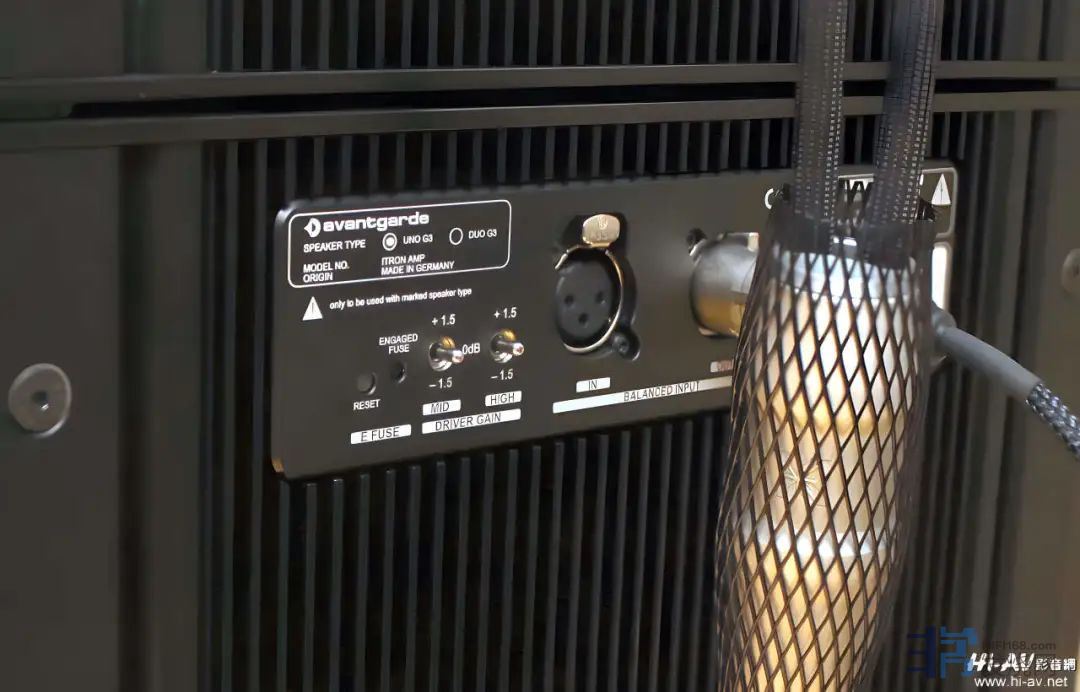 Avantgarde AcousticG3系列在低音部分都是主动式设计,中音与高音号角则有主动式与被动式可挑选,背面最上方部分就是被动式的喇叭接线板,上图下缘则是中音与高音号角主动式的内建iTRON放大模组。一般而言,两者不会同时出现在G3系列的背板上,但总代理胜旗所拥有者是特别向原厂订制的特别版,中音与高音号角的被动及主动模组同时安装,方便胜旗切换展示两种不同模式的音乐重播,本次聆赏评测Uno SD是以被动式为主,因此可以看到背板最上员接有喇叭线。