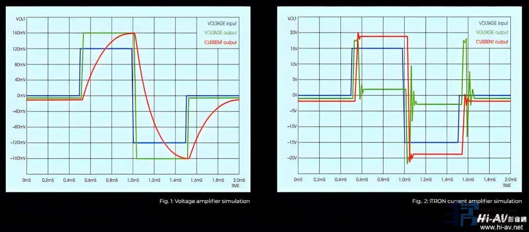 其实,搭载“iTRON”放大模组的全主动式G3系列不只是省去搭配扩大机的烦恼而已,相较被动式另加扩大机驱动,Avantgarde Acoustic认为是更完美优异的方式。因为,传统扩大机提供的是电压,但喇叭所得到的驱动电流是电压除以电阻所得,然而喇叭的阻抗并非固定值,而是不断变动的,这就使得驱动电流会有一些延迟。从上面两者的比较图表,就可看到红色线条(电流输出)有很大的分别。然而,电流驱动方式虽然更好,但是并无法有效驱动低音单体,也需要精准的电子分音,并且将单体的谐振频率滤除。由于以上三点,一般喇叭无法对应电流放大,但Avantgarde Acoustic的低音是主动式架构、也有精准的电子分音电路、再加上号角让单体失真极低也没有谐振问题,因此能完美搭配无负回授的“iTRON”放大模组,得到更宽广动态、更丰富细节、更好的解析与更具体的音场。