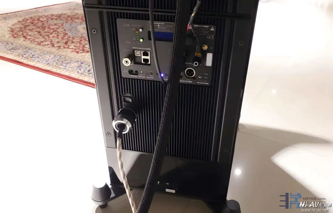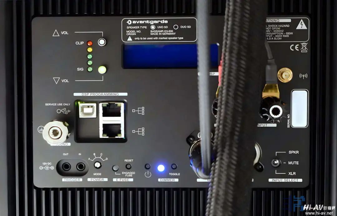 对应不同的低音单体尺寸与数量,各款喇叭的低音放大模组也各有专属对应,可以看到上图在Avantgarde商标下方,Uno SDDuo SD两个型号前方各有一个圆圈,可以让生产人员点入白点来区分是哪款制品所使用的低音驱动模组。其右侧最下方有XLR平衡音讯输入与输出埠,再上方是连结半主动式中音号角的喇叭线端子。左侧有乙太网路埠可以连接家庭区域网路,先前Avantgarde针对低频做空间声学优化的XD-Series Control软体,笔记型电脑必须以两条USB线分别连接Avantgarde XD系列喇叭,现在笔记型电脑只要透过无线网路,就可以与连上家庭区域网路的G3系列喇叭沟通操作。