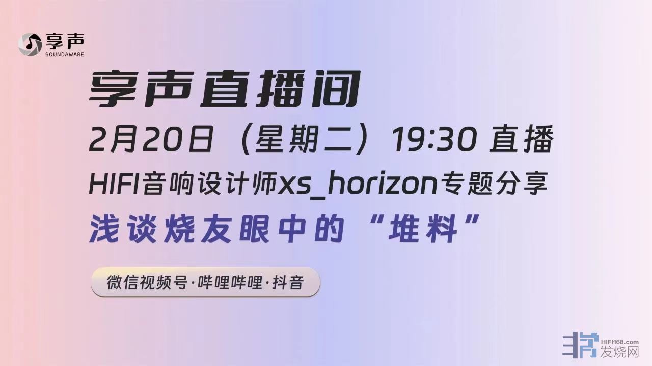 亲爱的烧友朋友们: 新年好!想死你们啦! 熟悉的星期二!熟悉的配方! 今天咱们HIFI音响设计师xs_Horizon的专题直播回来啦! xs_Horizon个人简介:性别男,享声SOUNDAWARE创始人之一,HiFI界的研发老兵,技术过硬的钢铁直男,人狠话还多的嵌入式数字音频大佬,大隐于世,小隐于每周二晚7点半享声直播间! 今天的直播主要谈一谈烧友眼中的“堆料”是怎么回事?“声音”与“堆料”之间到底是种啥关系?总之,直播间欢迎大家!今晚主打的就是一个该省省该花花!点击“预约”不错过,关注我们不迷路! 本期直播介绍: 本期直播享声产品研发负责人xs_Horizon与享声主播一起,谈一谈烧友眼中的“堆料”。欢迎烧友一起锁定每周二19:30享声直播,一起探讨HIFI话题!直播中主播将回答各位烧友对HIFI主题的提问,大家可以结合自己使用的系统、线材、电源以及HIFI观点进行讨论。 周三、周四和周五晚上19:00的三天直播中,同样欢迎广大烧友莅临!多多发言,多多互动!怕错过开播时间?还不赶紧提前关注我们官方号!或者添加享声官方微信18168081303,新闻信息第一时间掌握  视频号直播间地址: 手机视频号关注享声HIFI 哔哩哔哩直播间地址: http://t.cn/A6oFGQ7C 抖音直播间地址: http://t.cn/A6KKdvuK