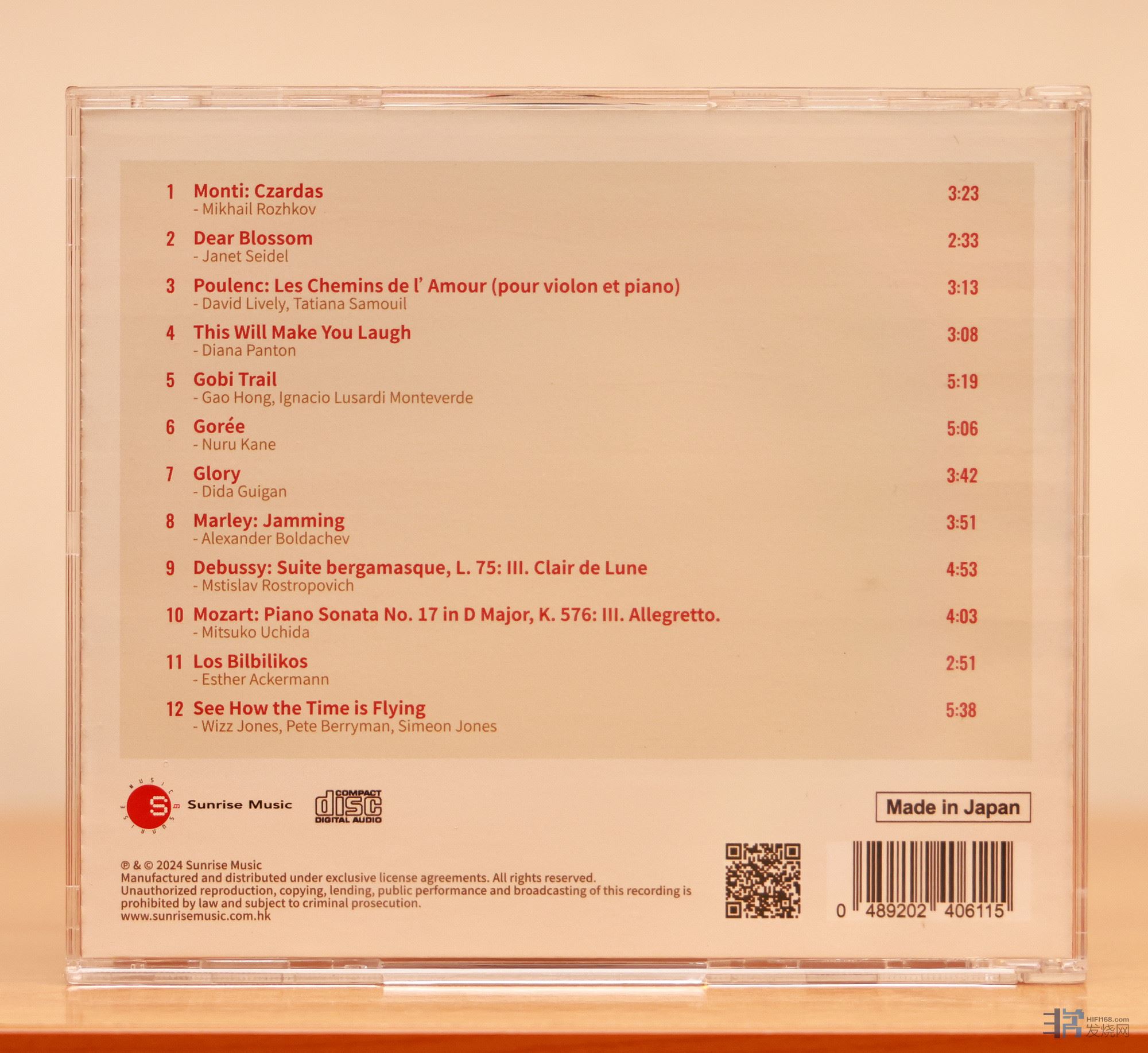 唱片曲目分别来着下面十二款上扬爱乐唱片,包括钢琴伴奏的三角琴版《查尔达斯》、爵士天后Janet Seidel以清新甜美嗓音演唱的《Dear Blossom》、钢琴、风笛、大提琴、短号一起演奏法国作曲家浦朗克《爱的小径》、琵琶和俄罗斯的三角琴合力演奏的中西经典名曲、印度结他大师,格林美获奖大提琴家,日本敲击乐高手以纯美不插电演绎的世界民谣、用竖琴改编演绎的流行金曲《Jamming》、罗斯卓波维奇演绎的德彪西《月光》、内田光子于1970年代弹奏的莫扎特D大调第17钢琴奏鸣曲......
