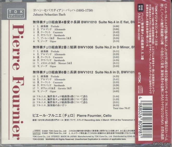 多年前就有了富尼埃的CD,旋即被他充满高贵气息的演绎打动了,但前段时间,收了王健的大无,不知不觉被王健的演奏吸引了,王的演奏,充满了强烈的人文气息,又非常打动人心,在说明书中,王健说到“ to be humbel, to wish but not desire, to love but not own", 也正是这套大无的注解,若要将自己心中的大无排名,现在应该是王健,富尼埃,斯塔克。(斯塔克内力深厚,但论感人则略逊一筹,至于其它的比如 SAFRAN,老罗等等,虽然也听过,但始终喜爱程度不及上述。
