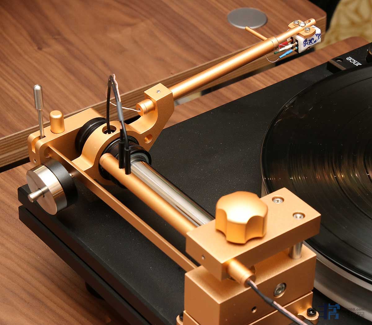这款金色的气浮唱臂适合搭配方形的唱盘。