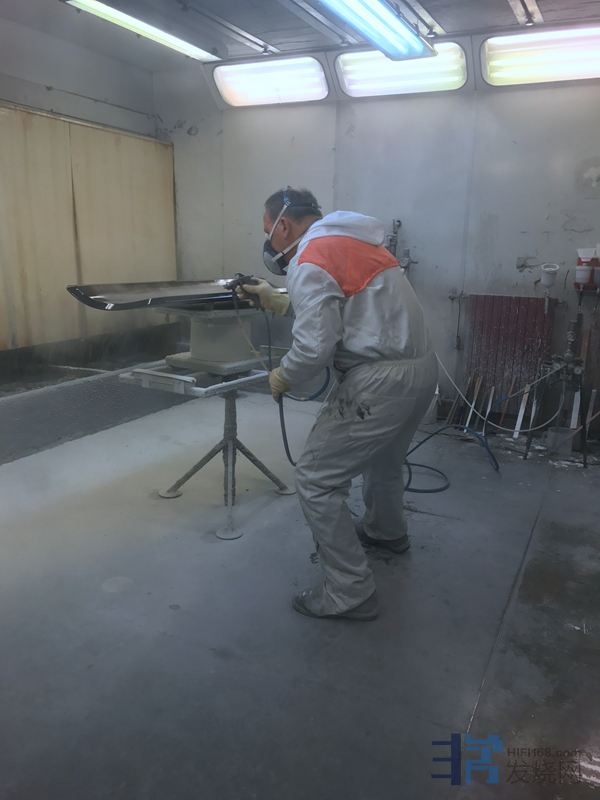 打蜡后的木箱还需要送到另一边密闭的喷漆车间进行封漆处理,木箱来到这里后需要喷上4层清漆把那个光滑如镜的表面保护起来,这样才宣告大功告成。