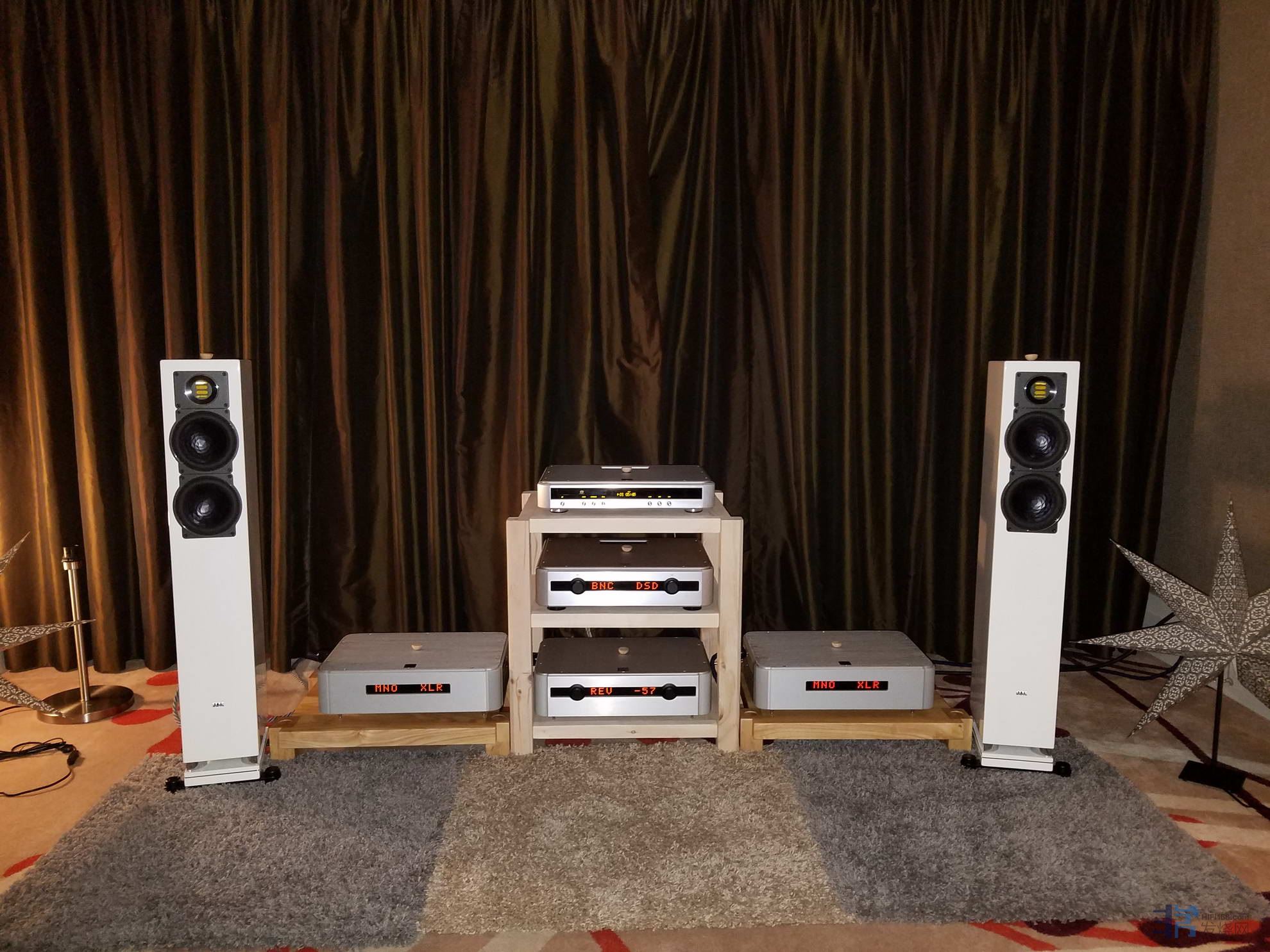 听了一会,觉得还是不太爽,这个展房的环境也还可以,左右音箱之间间距也凑合,但还是觉得声音不够松,那就老规矩,全部都上“魔块”。