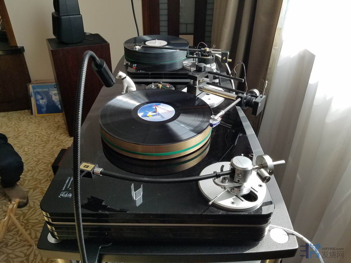 进入杰士铭的展放首先看到的是这台vpi与美歌嘅结合体,美歌的铜盘名震天下,好像国内杰士铭是第一个采用铜盘的。这个唱盘使用磁悬浮钨钢轴承,可以安装2支唱臂,底盘由5块15mm厚的亚克力板夹一块10mm厚的铝合金板构成,“三明治”结构能快速吸收和衰减谐振;转盘由11kg黄铜特殊防锈处理,铜的密度和质量在确保转动稳定的同时能有效抑制谐振,使声音更清晰,背景更黑暗。