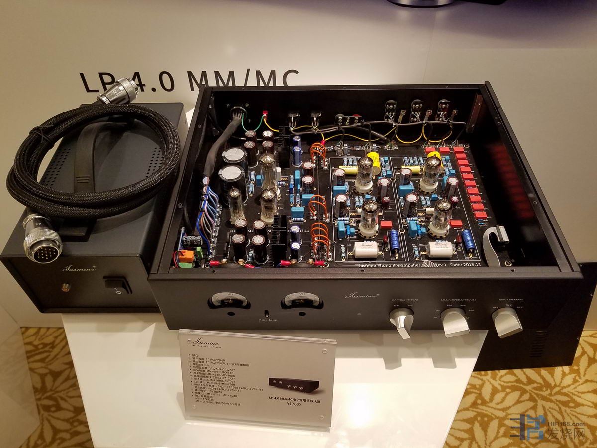 展会上看到的是最新出品的LP4.0全胆唱头放大器,采用黄色背光电平表头的复古外观电源部分配置3只电子管与放大部分有4 只电子管,高增益组合为2x12AX7+2x12AX7,低增益组合为2x12AU7+2x12AX7。此唱头放大器168很多网友正在使用,评价很高。