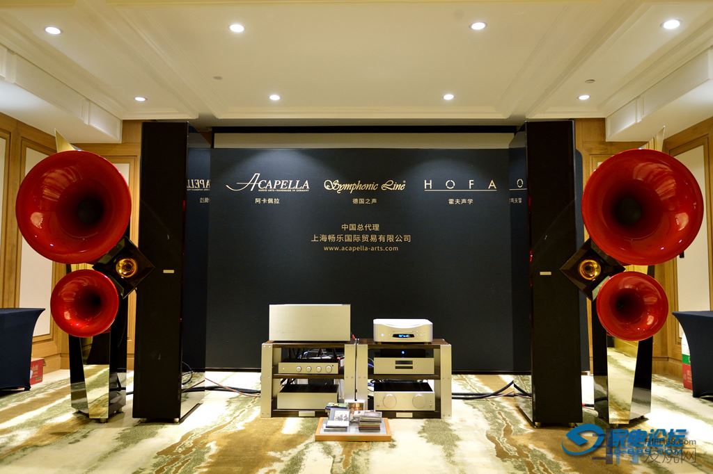 近年威虹音响拿下超过十多个高端音响品牌的中国区总代理,本次成都音响展会威虹音响携旗下代理的德国离子高音喇叭LanscheAudio冠廷、号角喇叭BlumenhoferAcoustics伯鲁门贺夫,OdeonAudio奥丁,Einstein爱因斯坦、SynstecAudio巅峰、Trigon精工与D.Klimo克里木等产品亮相。威虹音响周总亲自主持这个大房间的试听活动,我下午在这个展室认真试了近一个小时的各类音乐节目,并与周总和发烧友一起交流心得。这也是我第一次仔细聆听这对BlumenhoferAcoustics伯鲁门贺夫除厂家老板全球第二对的四十周年特别版的大音箱!搭配的功放是德国Einstein爱因斯坦全套器材,包括黑胶唱机、唱放、前后级。