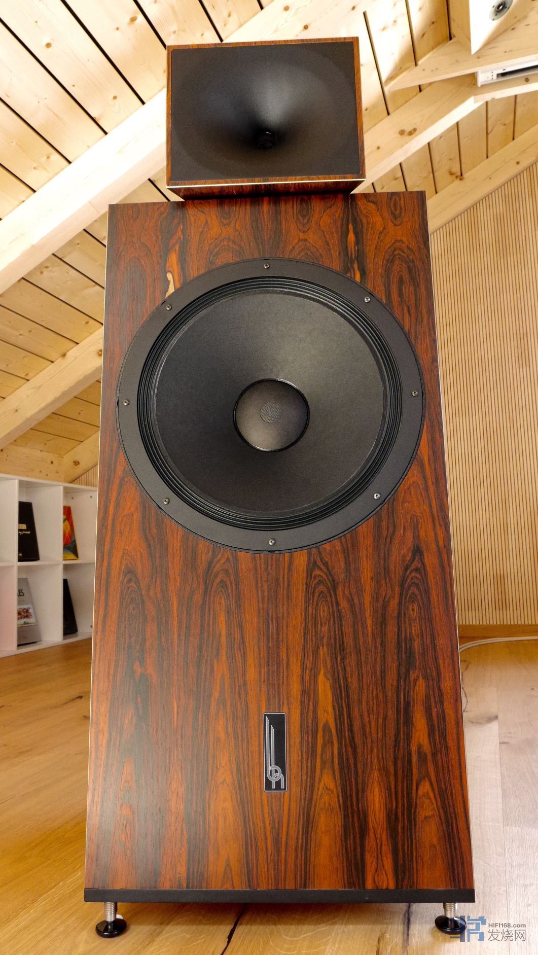 相比去年见到的一号,这次的二号在每个位置的制作工艺都更为考究了,比如高音号角压缩驱动头的安装改在了后面,因此不再见到号角上的螺丝孔了;比如号角支撑架的设计也更又美感了;比如整套音箱使用上重料的金属底座和不锈钢车制的大型脚锥了,令整体稳固度和调校便利性大幅改善。而喇叭线输入插座也采用三线分音设计,因此每声道3路单元可采用3台功放分别驱动,充分发挥喇叭单元的素质。