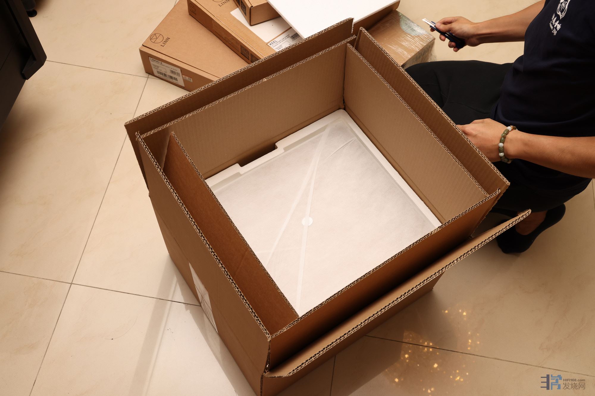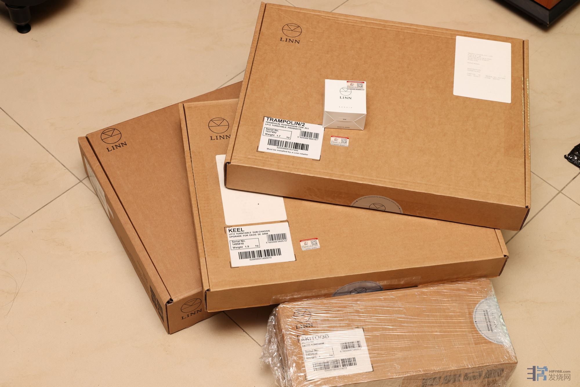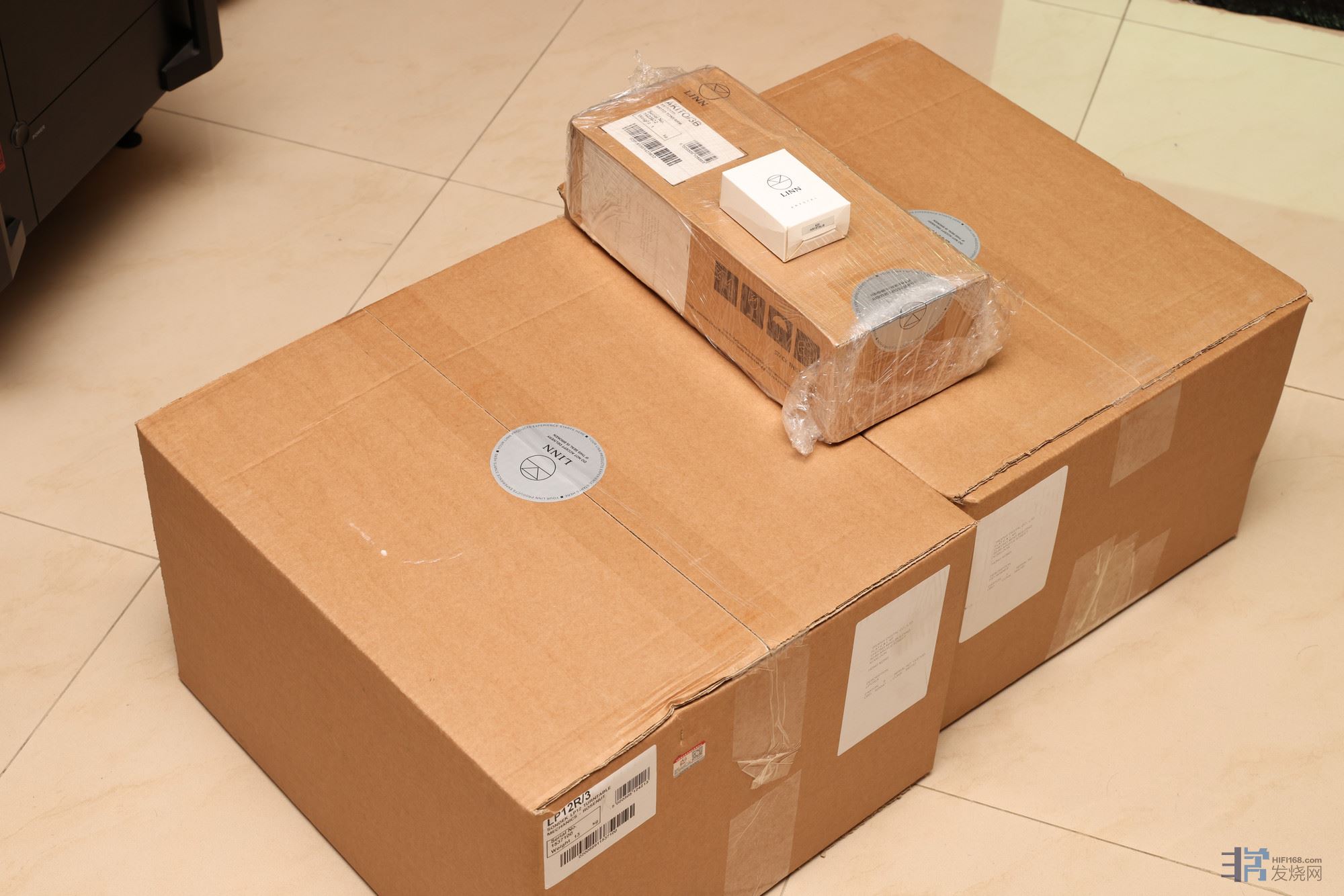 精确LP12是3个包装箱,其中白色的小盒子是精确12的原配唱头,下面的小箱子就是唱臂的包装盒。